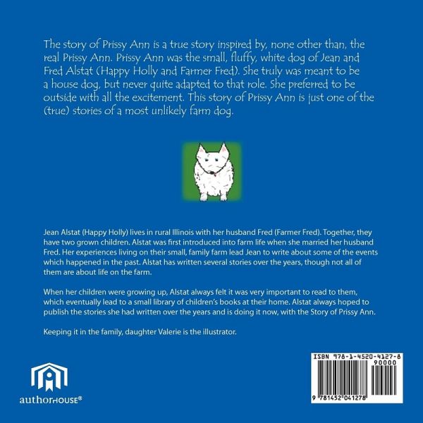 The story of Prissy Ann is a true story inspired by, none other than, the real Prissy Ann. Prissy Ann was the small, fluffy, white dog of Jean and Fred Alstat (Happy Holly and Farmer Fred). She truly was meant to be a house dog, but never quite adapted to that role. She preferred to be outside with all the excitement. This story of Prissy Ann is just one of the (true) stories of a most unlikely farm dog.