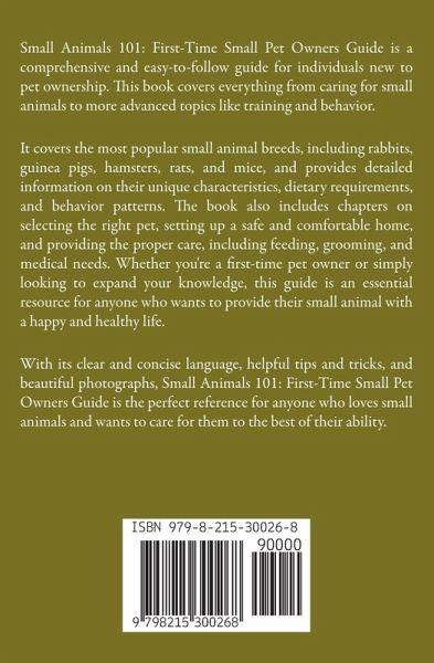Small Animals 101: First-Time Small Pet Owners Guide is a comprehensive and easy-to-follow guide for individuals who are new to pet ownership. This book covers everything from the basics of caring for small animals to more advanced topics like training and behavior. It covers the most popular small animal breeds, including rabbits, guinea pigs, hamsters, rats, and mice, and provides detailed information on their unique characteristics, dietary requirements, and behavior patterns. The book also includes chapters on selecting the right pet, setting up a safe and comfortable home, and providing the proper care, including feeding, grooming, and medical needs. Whether you're a first-time pet owner or simply looking to expand your knowledge, this guide is an essential resource for anyone who wants to provide their small animal with a happy and healthy life. With its clear and concise language, and helpful tips and tricks, Small Animals 101: First-Time Small Pet Owners Guide is the perfect reference for anyone who loves small animals and wants to care for them to the best of their ability.