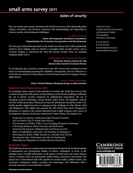 In examining various aspects of the provision of security, the Small Arms Survey 2011 considers the growth of the private security industry and its firearms holdings worldwide; the firearms holdings of private security personnel; the use of private security companies by multinational corporations; the use of emerging weapons technology among Western police forces; and legislative controls over the civilian possession of firearms in 42 jurisdictions around the world. Case studies provide original research on ongoing security challenges in Côte d'Ivoire, Haiti and Madagascar. This edition also presents the 2011 Small Arms Trade Transparency Barometer, an estimate of the annual authorized trade in light weapons, and a review of developments related to small arms control at the United Nations.