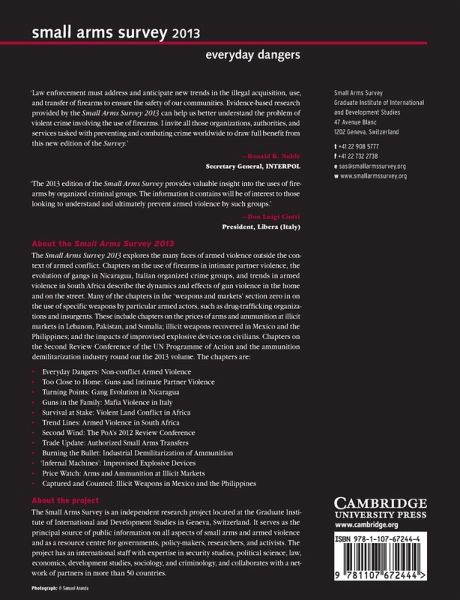 The Small Arms Survey 2013 explores the many faces of armed violence outside the context of armed conflict. Chapters on the use of firearms in intimate partner violence, the evolution of gangs in Nicaragua, Italian organised crime groups, and trends in armed violence in South Africa describe the dynamics and effects of gun violence in the home and on the street. Many of the chapters in the 'weapons and markets' section zero in on the use of specific weapons by particular armed actors, such as drug-trafficking organisations and insurgents. These include chapters on the prices of arms and ammunition at illicit markets in Lebanon, Pakistan and Somalia; illicit weapons recovered in Mexico and the Philippines; and the impacts of improvised explosive devices on civilians. Chapters on the Second Review Conference of the UN Programme of Action and the industrial demilitarisation industry round out the 2013 volume.