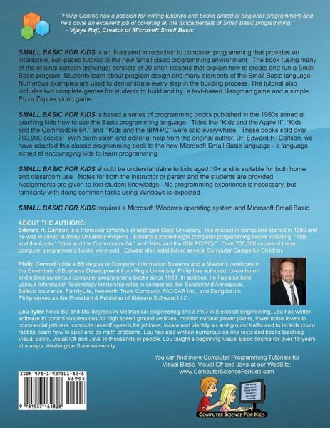 SMALL BASIC FOR KIDS is an illustrated introduction to computer programming that provides an interactive, parent/teacher facilitated tutorial to the new Microsoft Small Basic programming environment. The book consists of 30 short lessons that explain how to create and run a Small Basic program. Students learn about program design and many elements of the Small Basic language. Numerous examples are used to demonstrate every step in the building process. The tutorial also includes two complete games for students to build and try - a text-based Hangman game and a simple Pizza Zapper video game. SMALL BASIC FOR KIDS is based a series of programming books published in the 1980s aimed at teaching kids how to use the Basic programming language. Titles like "Kids and the Apple II", "Kids and the Commodore 64," and "Kids and the IBM-PC" were sold everywhere. These books sold over 700,000 copies! With permission and editorial help from the original author, Dr. Edward H. Carlson, we have adapted this classic programming book to the new Microsoft Small Basic language - a language aimed at encouraging kids to learn programming. SMALL BASIC FOR KIDS should be understandable to kids aged 10+ and is suitable for both home and classroom use. Notes for both the instructor or parent and the students are provided. Assignments are given to test student knowledge. No programming experience is necessary, but familiarity with doing common tasks using Windows is expected. SMALL BASIC FOR KIDS requires a Microsoft Windows operating system and Microsoft Small Basic 1.0 or higher.