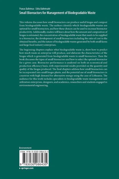 This volume discusses how small bioreactors can produce useful biogas and compost from biodegradable waste. The authors identify which biodegradable wastes are optimal for small bioreactors, and how these choices can be used to increase bioreactor productivity. Additionally, readers will learn about how the amount and composition of biogas is estimated, the concentration of biodegradable waste that needs to be supplied to a bioreactor, the development of small bioreactors including the ratio of cost to the obtained benefits, and the nature of biodegradable wastes generated by both small farms and large food industry enterprises. The beginning chapters explain what biodegradable waste is, show how to predict how much waste an enterprise will produce, and elaborate the characteristics of the biogas which is generated from biodegradable waste in small bioreactors. Then the book discusses the types of small bioreactors and how to select the optimal bioreactor for a given case. Bioreactor performance is analyzed on both an economical and production efficiency basis, with experimental results provided on the quantity and quality of the biogas produced. The final chapters address how small bioreactors can be incorporated into small biogas plants, and the potential use of small bioreactors in countries with high demand for alternative energy using the case of Lithuania. The audience for this work includes specialists in biodegradable waste management and utilization enterprises, designers, and academics, researchers and students engaged in environmental engineering.