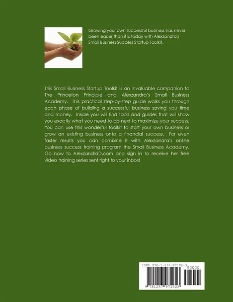 This Small Business Startup Toolkit is an invaluable companion to The Princeton Principle and Alexzandra's Small Business Academy. This practical step-by-step guide walks you through each phase of building a successful business saving you time and money. Inside you will find tools and guides that will show you exactly what you need to do next to maximize your success. You can use this wonderful toolkit to start your own business or grow an existing business onto a financial success. For even faster results you can combine it with Alexzandra's online business success training program the Small Business Academy. Go now to AlexzandraD.com and sign in to receive her free video training series sent right to your inbox!