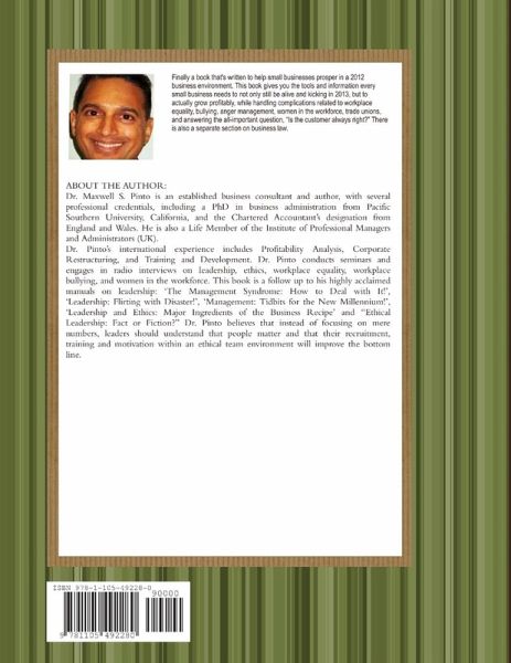 Finally, a book that's written to help small businesses prosper in a 2012 business environment. This book gives you the tools and information every small business needs to not only still be alive and kicking in 2013, but to actually grow profitably, while handling complications related to workplace equality, bullying, anger management, women in the workforce, trade unions, and answering the all-important question, "Is the customer always right?" There is also a separate section on business law.
