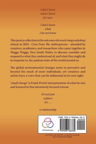 I don't knowwhat I knowfor sureI don't knowwhatI do not know ~ This poetry collection is the outcome of a week-long workshop retreat in 2024 - Cries From The Anthropocene - attended by creatives, academics, and researchers who came together in Wagga Wagga, New South Wales, to discuss, consider and respond to what they understood and what they might do in response to the parlous state of the world around us. The global environmental changes seem so pervasive and beyond the reach of mere individuals, yet creatives and artists have a voice that can be influential in its own right. 'small change' is Frank Prem's interpretation of what he saw and learned in this intensively focused retreat. ~ it's not justa placeit's . . .a relationship