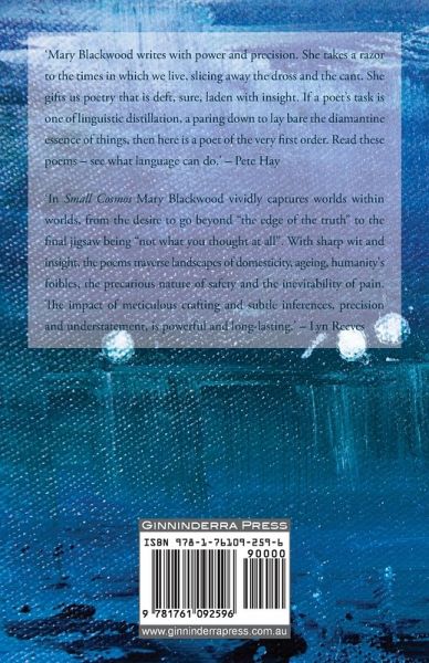 'Mary Blackwood writes with power and precision. She takes a razor to the times in which we live, slicing away the dross and the cant. She gifts us poetry that is deft, sure, laden with insight. If a poet's task is one of linguistic distillation, a paring down to lay bare the diamantine essence of things, then here is a poet of the very first order. Read these poems - see what language can do.' -- Pete Hay 'In Small Cosmos Mary Blackwood vividly captures worlds within worlds, from the desire to go beyond 'the edge of the truth' to the final jigsaw being 'not what you thought at all'. With sharp wit and insight, the poems traverse landscapes of domesticity, ageing, humanity's foibles, the precarious nature of safety and the inevitability of pain. The impact of meticulous crafting and subtle inferences, precision and understatement, is powerful and long-lasting.' - Lyn Reeves