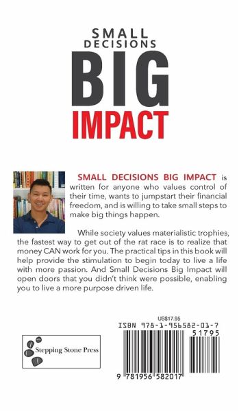SMALL DECISIONS BIG IMPACT is written for anyone who values control of their time, wants to jumpstart their financial freedom, and is willing to take small steps to make big things happen. While society values materialistic trophies, the fastest way to get out of the rat race is to realize that money CAN work for you. The practical tips in this book will help provide the stimulation to begin today to live a life with more passion. And Small Decisions Big Impact will open doors that you didn't think were possible, enabling you to live a more purpose driven life.