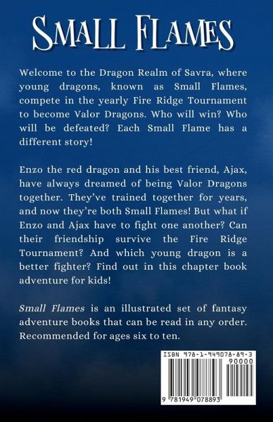 Welcome to the Dragon Realm of Savra, where young dragons, known as Small Flames, compete in the yearly Fire Ridge Tournament to become Valor Dragons. Who will win? Who will be defeated? Each Small Flame has a different story! Enzo the red dragon and his best friend, Ajax, have always dreamed of being Valor Dragons together. They've trained together for years, and now they're both Small Flames! But what if Enzo and Ajax have to fight one another? Can their friendship survive the Fire Ridge Tournament? And which young dragon is a better fighter? Find out in this chapter book adventure for kids! Small Flames is an illustrated set of fantasy adventure chapter books that can be read in any order. Recommended for ages 6 to 10.