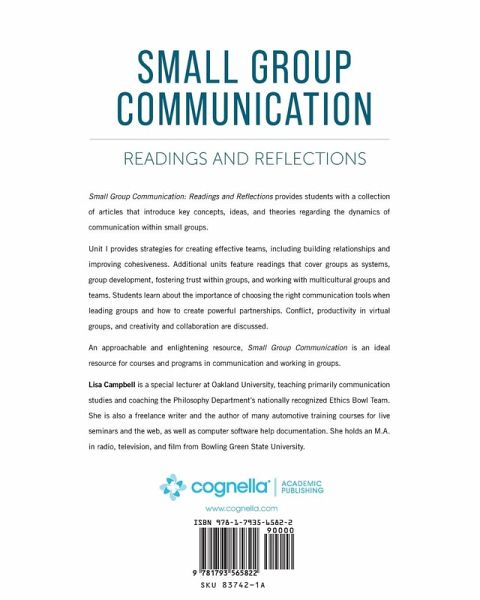 Small Group Communication: Readings and Reflections provides students with a collection of articles that introduce key concepts, ideas, and theories regarding the dynamics of communication within small groups. Unit I provides strategies for creating effective teams, including building relationships and improving cohesiveness. Additional units feature readings that cover groups as systems, group development, fostering trust within groups, and working with multicultural groups and teams. Students learn about the importance of choosing the right communication tools when leading groups and how to create powerful partnerships. Conflict, productivity in virtual groups, and creativity and collaboration are discussed. An approachable and enlightening resource, Small Group Communication is an ideal resource for courses and programs in communication and working in groups.