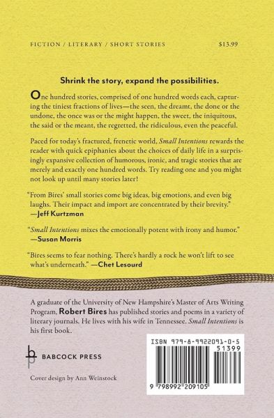 Small Intentions: one hundred stories comprised of one hundred words each, capturing the tiniest fractions of lives-the seen, the dreamt, the done or the undone, the once was or the might happen, the sweet, the iniquitous, the said or the meant, the regretted, the ridiculous, even the peaceful. Like flashes from a strobe, these stories, often with a mor- dant sense of humor, freeze, distort, and illuminate their characters before releasing them back into the larger whole of existence.