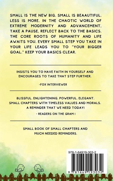 Editorial Reviews Every step counts, it adds up to the bigger picture, Infact it cumulatively creates the bigger picture. - Abhyudaya Times Insists you to have faith in yourself and take that small step, which later turns out to be a big one. Small start matters to drive further towards larger aim." --AsiaTimesNow "Perfect pick for the ones starting their reading journey. Recommended to all age groups. Transforming and enlightening." -Dailyhunt Description Small is the New BIG. Small is beaautiful. Less is more. In the chaotic world of extreme modernity and advancement, take a pause, reflect back to the basics. The core roots of humanity and life awaits you. Every small step you take in your life leads you to "your bigger goal." Keep your basics clear.