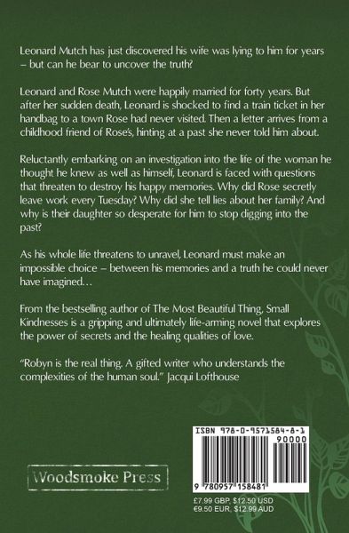 Leonard Mutch has just discovered his wife was lying to him for years - but can he bear to uncover the truth? Leonard and Rose Mutch were happily married for forty years. But after her sudden death, Leonard is shocked to find a train ticket in her handbag to a town Rose had never visited. Then a letter arrives from a childhood friend of Rose's, hinting at a past she never told him about. Reluctantly embarking on an investigation into the life of the woman he thought he knew as well as himself, Leonard is faced with questions that threaten to destroy his happy memories. Why did Rose secretly leave work every Tuesday? Why did she tell lies about her family? And why is their daughter so desperate for him to stop digging into the past? As his whole life threatens to unravel, Leonard must make an impossible choice - between his memories and a truth he could never have imagined... From the bestselling author of The Most Beautiful Thing, Small Kindnesses is a gripping and ultimately life-affirming novel that explores the power of secrets and the healing qualities of love. Small Kindnesses is by Satya Robyn (previously Fiona Robyn). Previously sold as 'The Blue Handbag' PRAISE FOR SATYA ROBYN "Robyn is the real thing. A gifted writer who understands the complexities of the human soul." Jacqui Lofthouse "A thoughtful and moving writer who has a great sense of human emotion." Michael Kimball "An entirely entrancing tale." Caroline Smailes