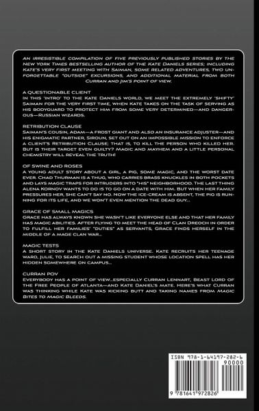 An irresistible compilation of five previously published stories by the New York Times bestselling author of the Kate Daniels series; including Kate's very first meeting with Saiman, some related adventures, two unforgettable "outside" excursions, and additional material from both Curran and Jim's point of view. A QUESTIONABLE CLIENT In this 'intro' to the Kate Daniels world, we meet the extremely 'shifty' Saiman for the very first time, when Kate takes on the task of serving as his bodyguard to protect him from some very determined-and dangerous-Russian wizards. RETRIBUTION CLAUSE Saiman's cousin, Adam-a frost giant and also an insurance adjuster-and his enigmatic partner, Siroun, set out on an impossible mission to enforce a client's Retribution Clause; that is, to kill the person who killed her. But is their target even guilty? Magic and mayhem and a little personal chemistry will reveal the truth! OF SWINE AND ROSES A young adult story about a girl, a pig, some magic, and the worst date ever. Chad Thurman is a thug, who carries brass knuckles in both pockets and lays magic traps for intruders into "his" neighborhood. The last thing Alena Kornov wants to do is to go on a date with him. But when her family pressures her, she can't say no. Now the ice-cream is absent, the pig is running for its life, and we won't even mention the dead guy... GRACE OF SMALL MAGICS Grace has always known she wasn't like everyone else and that her family has magic abilities. After flying to meet the head of Clan Dreoch in order to fulfill her families' "duties" as servants, Grace finds herself in the middle of a mage clan war... MAGIC TESTS A short story in the Kate Daniels universe. Kate recruits her teenage ward, Julie, to search out a missing student whose location spell has her hidden somewhere on campus... CURRAN POV Everybody has a point of view...especially Curran Lennart, Beast Lord of the Free People of Atlanta-and Kate Daniel's mate. Here's what Curran was thinking while Kate was kicking butt and taking names from Magic Bites to Magic Bleeds.