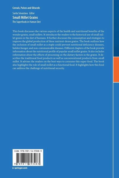 Chapter 1. Small Millets: An Overview.- Chapter 2. Nutritional Profile of Small Millets.- Chapter 3. Processing of Small Millets.- Chapter 4. Effect of Processing on Antioxidant Potential and Antinutritional Factors in Small Millets.- Chapter 5. Small Millets Based Traditional and Unconventional Food Products.- Chapter 6. Small Millets Functional Foods.- Chapter 7. Small Millets Based Baby Food.- Chapter 8. Small Millets: Path to Food and Nutrition Security.