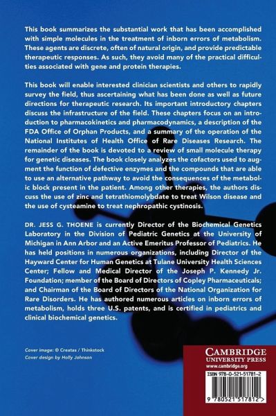 1. FDA and the regulation of small molecules for orphan diseases Marlene Haffner and Tan Nguyen; 2. The office of rare diseases research: serving a coordinating function at the national institutes of health Stephen C. Groft; 3. Introduction to pharmacokinetics and pharmacodynamics Juan J. L. Lertora and Konstantina M. Vanevski; 4. Biotin and biotin-responsive disorders Barry Wolf and Kirit Pindolia; 5. Cobalamin treatment of methylmalonic acidemias Hans C. Andersson; 6. Sapropterin treatment of phenylketonuria Barbara K. Burton; 7. L-carnitine therapy in primary and secondary carnitine deficiency disorders Susan C. Winter, Brian Schreiber and Neil R. M. Buist; 8. Cysteamine treatment of nephropathic cystinosis Jess Thoene; 9. Nitisinone use in hereditary tyrosinemia and alkaptonuria William A. Gahl, Wendy J. Introne and Kevin O'Brien; 10. Alternative waste nitrogen disposal agents for urea cycle disorders Gregory M. Enns; 11. PDMP based glucosylceramide synthesis inhibitors for Gaucher and Fabry disease James A. Shayman; 12. Betaine treatment for the homocystinurias Harvey L. Levy and Amy Lawson-Yuen; 13. Zinc and tetrathiomolybdate for the treatment of Wilson's disease George J. Brewer; 14. Small copper complexes for treatment of ATP7A-related disorders Stephen G. Kaler.