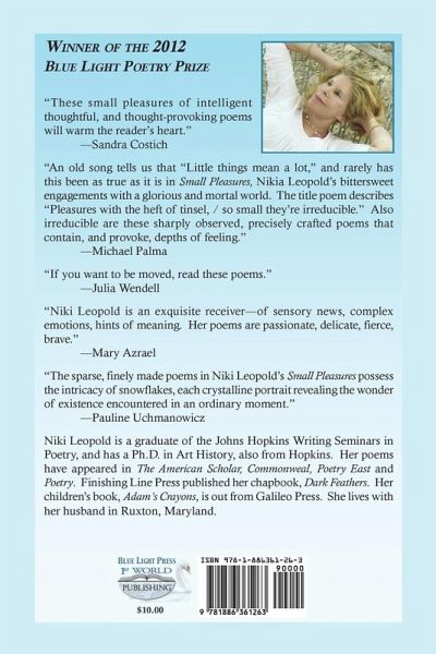 "These small pleasures of intelligent thoughtful, and thought-provoking poems will warm the reader's heart." -Sandra Costich "An old song tells us that "Little things mean a lot," and rarely has this been as true as it is in Small Pleasures, Nikia Leopold's bittersweet engagements with a glorious and mortal world. The title poem describes "Pleasures with the heft of tinsel, / so small they're irreducible." Also irreducible are these sharply observed, precisely crafted poems that contain, and provoke, depths of feeling." -Michael Palma "If you want to be moved, read these poems." -Julia Wendell "Niki Leopold is an exquisite receiver-of sensory news, complex emotions, hints of meaning. Her poems are passionate, delicate, fierce, brave." -Mary Azrael "The sparse, finely made poems in Niki Leopold's Small Pleasures possess the intricacy of snowflakes, each crystalline portrait revealing the wonder of existence encountered in an ordinary moment." -Pauline Uchmanowicz Niki Leopold is a graduate of the Johns Hopkins Writing Seminars in Poetry, and has a Ph.D. in Art History, also from Hopkins. Her poems have appeared in The American Scholar, Commonweal, Poetry East and Poetry. Finishing Line Press published her chapbook, Dark Feathers. Her children's book, Adam's Crayons, is out from Galileo Press. She lives with her husband in Ruxton, Maryland.