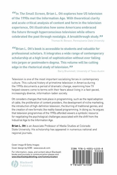 "In The Small Screen, Brian L. Ott explores how UStelevision of the 1990s met the Information Age. With theoreticalclarity and acute critical analysis of content and form in thetelevision experience, Ott illustrates how some Americans embracedthe future through hyperconscious television while otherscelebrated the past through nostalgia. A breakthrough study."
