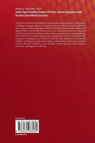 Introduction.- Linearized Model of Power Transmission Systems with Large-Scale Wind Power Generation.- Damping Torque Analysis for Power Systems with the DFIG-Based Wind Farms.- Model Analysis of Small-Signal Angular Stability of a Power System Affected by Wind Generation.- Analysis of Power System Sub-Synchronous Oscillations Caused by Grid Connection of Wind Power Generation.- Small-Signal Stability of Power Systems Integrated with VSC HVDC Line/MTDC Network for Wind Power Transmission.- Probabilistic Small-Signal Stability of Power Systems with Wind Power Generation.