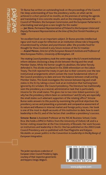 'An excellent book on an important subject. Dr Bunse provides intellectual rigour and much scope for reflection on an institution whose role is frequently misunderstood by scholars and practitioners alike.In addressing the role of the rotating Presidency, and providing a useful critique of schemes to replace it with something more permanent, she provides food for thought for those involved in any future revision of the EU treaties. More broadly, in explaining the role of the Presidency in Institutionalist terms as an instance of intergovernmental entrepreneurship, she also challenges much of the extant literature which argues, or assumes, that it is supranationalism alone which renders integration effective.'