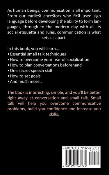 As human beings, communication is all important. From our earliest ancestors who first used sign language before developing the ability to form languages, through to the modern day with all its social etiquette and rules, communication is what sets us apart. In this book, you will learn.... ¿ Essential small talk techniques ¿ How to overcome your fear of socialization ¿ How to plan conversations beforehand ¿ One secret speech skill ¿ How to set goals ¿ And much more.. The book is interesting, simple, and you'll be better right away at conversation and small talk. Small talk will help you overcome communicative problems, build you confidence and increase you skills.