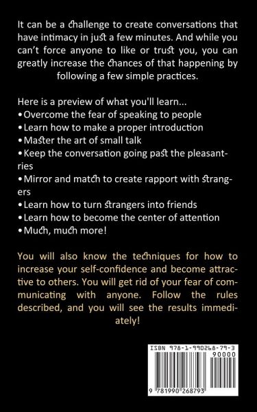 It can be a challenge to create conversations that have intimacy in just a few minutes. And while you can't force anyone to like or trust you, you can greatly increase the chances of that happening by following a few simple practices. Here is a preview of what you'll learn... ¿ Overcome the fear of speaking to people ¿ Learn how to make a proper introduction ¿ Master the art of small talk ¿ Keep the conversation going past the pleasantries ¿ Mirror and match to create rapport with strangers ¿ Learn how to turn strangers into friends ¿ Learn how to become the center of attention ¿ Much, much more! You will also know the techniques for how to increase your self-confidence and become attractive to others. You will get rid of your fear of communicating with anyone. Follow the rules described, and you will see the results immediately!
