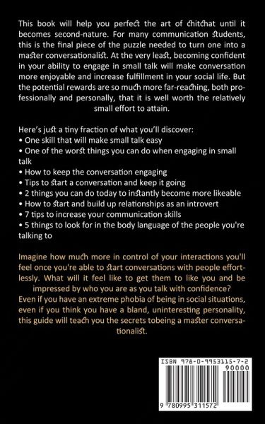 This book will help you perfect the art of chitchat until it becomes second-nature. For many communication students, this is the final piece of the puzzle needed to turn one into a master conversationalist. At the very least, becoming confident in your ability to engage in small talk will make conversation more enjoyable and increase fulfillment in your social life. But the potential rewards are so much more far-reaching, both professionally and personally, that it is well worth the relatively small effort to attain. Here's just a tiny fraction of what you'll discover:One skill that will make small talk easy One of the worst things you can do when engaging in small talk How to keep the conversation engaging Tips to start a conversation and keep it going 2 things you can do today to instantly become more likeable How to start and build up relationships as an introvert 7 tips to increase your communication skills 5 things to look for in the body language of the people you're talking to Imagine how much more in control of your interactions you'll feel once you're able to start conversations with people effortlessly. What will it feel like to get them to like you and be impressed by who you are as you talk with confidence? Even if you have an extreme phobia of being in social situations, even if you think you have a bland, uninteresting personality, this guide will teach you the secrets tobeing a master conversationalist.