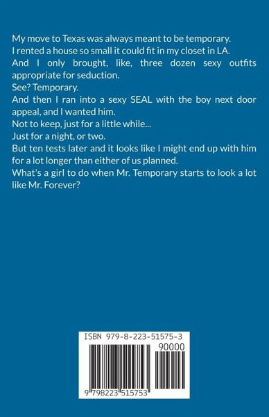 My move to Texas was always meant to be temporary. I rented a house so small it could fit in my closet in LA. And I only brought, like, three dozen sexy outfits appropriate for seduction. See? Temporary. And then I ran into a sexy SEAL with the boy next door appeal, and I wanted him. Not to keep, just for a little while... Just for a night, or two. But ten tests later and it looks like I might end up with him for a lot longer than either of us planned. What's a girl to do when Mr. Temporary starts to look a lot like Mr. Forever?