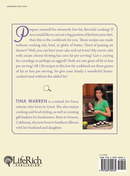 Prepare yourself for extremely low-fat, flavorful cooking! If you would like to cut out a big portion of fat from your diet, then this is the cookbook for you. These recipes are made without cooking oils, beef, or globs of butter. Tired of passing on dessert? Well, you can have your cake and eat it too! My carrot cake with cream cheese frosting has zero fat per serving! Got a craving for corndogs or perhaps an eggroll? Both are one gram of fat or less per serving! All 130 recipes in this low fat cookbook are three grams of fat or less per serving. So give your family a wonderful home-cooked meal without the added fat!