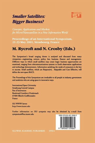 Y. Fujimori, Symposium Programme Committee Chair, and Faculty Member, International Space University e-mail: fujimori@isu.isunet.edu M.Rycroft, Faculty Member, International Space University e-mail: rycroft@isu.isunet.edu N. Crosby, International Space University e-mail: norma@bock-crosby.fsbusines.co.uk For the sixth annual ISU Symposium the theme was "Smaller Satellites: Bigger Business? Concepts, Applications and Markets for Micro/Nanosatellites in a New Information World". Thus, the Symposium addressed the crucial question: are small satellites the saviour of space programmes around the…mehr