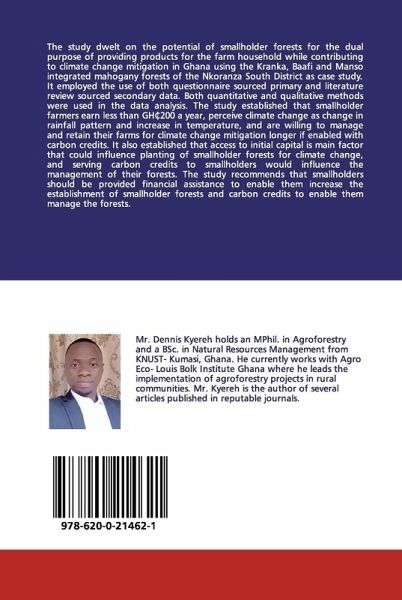 The study dwelt on the potential of smallholder forests for the dual purpose of providing products for the farm household while contributing to climate change mitigation in Ghana using the Kranka, Baafi and Manso integrated mahogany forests of the Nkoranza South District as case study. It employed the use of both questionnaire sourced primary and literature review sourced secondary data. Both quantitative and qualitative methods were used in the data analysis. The study established that smallholder farmers earn less than GH 200 a year, perceive climate change as change in rainfall pattern and increase in temperature, and are willing to manage and retain their farms for climate change mitigation longer if enabled with carbon credits. It also established that access to initial capital is main factor that could influence planting of smallholder forests for climate change, and serving carbon credits to smallholders would influence the management of their forests. The study recommendsthat smallholders should be provided financial assistance to enable them increase the establishment of smallholder forests and carbon credits to enable them manage the forests.