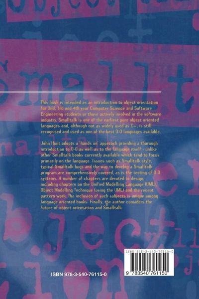 This book was originally written to support an introductory course in Object Orientation through the medium of Smalltalk (and VisualWorks in particular). However, it can be used as a book to teach the reader Smalltalk, to introduce object orientation as well as present object oriented design and analysis. It takes as its basic premise that most Computer Scientists I Software Engineers learn best by doing rather than from theoretical notes. The chapters therefore attempt to introduce concepts by getting you the reader to do things, rather than by extensive theoretical discussions. This means that these chapters take a hands-on approach to the subject and assume that the student/reader has a suitable Small talk environment available to them. The chapters are listed below and are divided into six parts. The reader is advised to work through Parts 1 and 3 thoroughly in order to gain a detailed understanding of object orientation. Part 2 then provides an introduction to the Smalltalk environment and language. Other chapters may then be dipped into as required. For example, if the reader wishes to hone their Smalltalk skills then the chapters in Part 4 would be useful. However, if at that point they wish to get on and discover the delights of graphical user interfaces in Smalltalk, then Part 5 could be read next. Part 6 presents some more advances subjects such as metaclasses and concurrency which are not required for straight forward Small talk development.