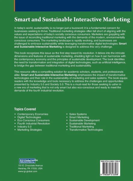 In today's world, sustainability is no longer just a buzzword; it is a fundamental concern for businesses seeking to thrive. Traditional marketing strategies often fall short of aligning with the values and expectations of today's socially conscious consumers. Marketers are grappling with the issue of reconciling traditional marketing with the demands of the modern, environmentally conscious consumers. The marketing landscape is rapidly evolving, and businesses are challenged to embrace sustainability while leveraging transformative digital technologies. Smart and Sustainable Interactive Marketing is designed to address this very challenge. This book recognizes this issue as the first step toward its resolution. It delves into the intricate dimensions and features of sustainable marketing, shedding light on how it can harmonize with the contemporary economy and the principles of sustainable development. The book identifies the need for transformation and integration of digital technologies, such as artificial intelligence, to bridge the gap between traditional marketing and sustainability.