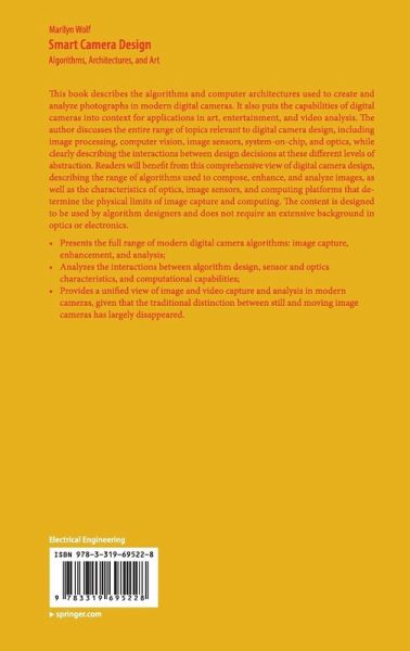 This book describes the algorithms and computer architectures used to create and analyze photographs in modern digital cameras. It also puts the capabilities of digital cameras into context for applications in art, entertainment, and video analysis. The author discusses the entire range of topics relevant to digital camera design, including image processing, computer vision, image sensors, system-on-chip, and optics, while clearly describing the interactions between design decisions at these different levels of abstraction. Readers will benefit from this comprehensive view of digital camera design, describing the range of algorithms used to compose, enhance, and analyze images, as well as the characteristics of optics, image sensors, and computing platforms that determine the physical limits of image capture and computing. The content is designed to be used by algorithm designers and does not require an extensive background in optics or electronics.
