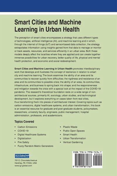 The perception of smart cities encompasses a strategy that uses different types of technologies, artificial intelligence (AI), and machine learning and in which, through the internet of things (IoT) and sensor-based data collection, the strategy extrapolates information using insights gained from that data to manage or monitor or track assets, resources, and services efficiently in an urban area. Both these models deeply affect the localities where they are applied and can create together immense possibilities for urban recovery, better quality of life, physical and mental health protection, and economic and social redevelopment. ¿Smart Cities and Machine Learning in Urban Health promotes interdisciplinary work that develops and illustrates the concept of resilience in relation to smart city and machine learning. The book examines the ability of an area and its communities to recover quickly from difficulties; the rigidness and resistance of an area and its communities to possible crisis; the ability of an area, its communities, infrastructure, and business to spring back into shape; and the responsiveness and mitigation towards the crisis with a special look at the impact of the COVID-19 pandemic. The research's theoretical foundation rests on a wide range of non-architectural sources, primarily AI, sociology, urban studies, and technological development, but it explores everything on cases taken from real cities, thus transforming them into pieces of architectural interest. Covering topics such as carbon emissions, digital healthcare systems, and urban transformation, this book is an essential resource for graduate and post-graduate students, policymakers, researchers, university faculty, engineers, public management, hospital administration, professors, and academicians.