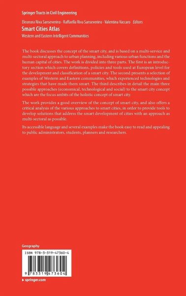 The book discusses the concept of the smart city, and is based on a multi-service and multi-sectoral approach to urban planning, including various urban functions and the human capital of cities. The work is divided into three parts. The first is an introductory section which covers definitions, policies and tools used at European level for the development and classification of a smart city. The second presents a selection of examples of Western and Eastern communities, which experienced technologies and strategies that have made them smart. The third describes in detail the main three possible approaches (economical, technological and social) to the smart city concept which are the focus ambits of the holistic concept of smart city.