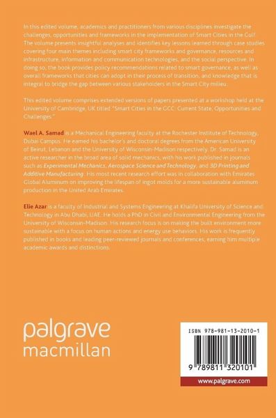 In this edited volume, academics and practitioners from various disciplines investigate the challenges, opportunities and frameworks in the implementation of Smart Cities in the Gulf.The volume presents insightful analyses and identifies key lessons learned through case studies covering four main themes including smart city frameworks and governance, resources and infrastructure, information and communication technologies, and the social perspective. In doing so, the book provides policy recommendations related to smart governance, as well as overall frameworks that cities can adopt in their process of transition, and knowledge that is integral to bridge the gap between various stakeholders in the Smart City milieu. This edited volume comprises extended versions of papers presented at a workshop held at the University of Cambridge, UK titled "Smart Cities in the GCC: Current State, Opportunities and Challenges."
