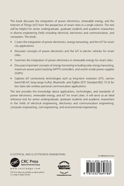 This book discusses the integration of power electronics, renewable energy, and the Internet of Things (IoT) from the perspective of smart cities in a single volume. The text will be helpful for senior undergraduate, graduate students and academic researchers in diverse engineering fields including electrical, electronics and communication, and computers. The book: Covers the integration of power electronics, energy harvesting, and the IoT for smart city applicationsDiscusses concepts of power electronics and the IoT in electric vehicles for smart citiesExamines the integration of power electronics in renewable energy for smart citiesDiscusses important concepts of energy harvesting including solar energy harvesting, maximum power point tracking (MPPT) controllers, and switch-mode power supplies (SMPS)Explores IoT connectivity technologies such as long-term evolution (LTE), narrow band NB-IoT, long-range (LoRa), Bluetooth, and ZigBee (IEEE Standard 802.15.4) for low data rate wireless personal communication applications The text provides the knowledge about applications, technologies, and standards of power electronics, renewable energy, and IoT for smart cities. It will serve as an ideal reference text for senior undergraduate, graduate students and academic researchers in the fields of electrical engineering, electronics and communication engineering, computer engineering, civil engineering, and environmental engineering.