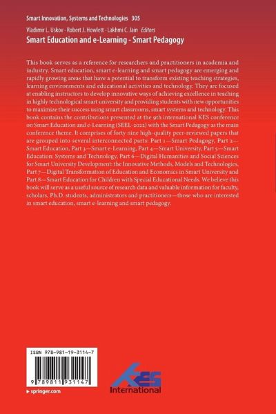 This book serves as a reference for researchers and practitioners in academia and industry. Smart education, smart e-learning and smart pedagogy are emerging and rapidly growing areas that have a potential to transform existing teaching strategies, learning environments and educational activities and technology. They are focused at enabling instructors to develop innovative ways of achieving excellence in teaching in highly technological smart university and providing students with new opportunities to maximize their success using smart classrooms, smart systems and technology. This book contains the contributions presented at the 9th international KES conference on Smart Education and e-Learning (SEEL-2022) with the Smart Pedagogy as the main conference theme. It comprises of forty nine high-quality peer-reviewed papers that are grouped into several interconnected parts: Part 1-Smart Pedagogy, Part 2-Smart Education, Part 3-Smart e-Learning, Part 4-Smart University, Part 5-SmartEducation: Systems and Technology, Part 6-Digital Humanities and Social Sciences for Smart University Development: the Innovative Methods, Models and Technologies, Part 7-Digital Transformation of Education and Economics in Smart University and Part 8-Smart Education for Children with Special Educational Needs. We believe this book will serve as a useful source of research data and valuable information for faculty, scholars, Ph.D. students, administrators and practitioners-those who are interested in smart education, smart e-learning and smart pedagogy.