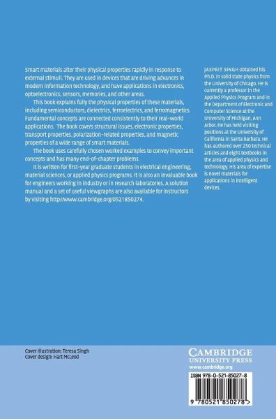 Smart materials respond rapidly to external stimuli to alter their physical properties. They are used in devices that are driving advances in modern information technology and have applications in electronics, optoelectronics, sensors, memories and other areas. This book fully explains the physical properties of these materials, including semiconductors, dielectrics, ferroelectrics, ferromagnetics and organic polymers. Fundamental concepts are consistently connected to their real-world applications. It covers structural issues, electronic properties, transport properties, polarization-related properties and magnetic properties of a wide range of smart materials. The book contains carefully chosen worked examples to convey important concepts and has many end-of-chapter problems. It is written for first year graduate students in electrical engineering, materials science or applied physics programs. It is also an invaluable book for engineers working in industry or research laboratories. A solution manual and a set of useful viewgraphs are also available for instructors.