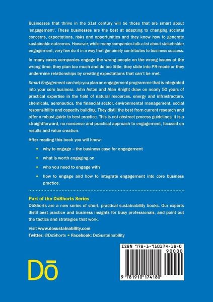 Businesses that thrive in the 21st century will be those that are smart about "engagement". These businesses are the best at adapting to changing societal concerns, expectations, risks and opportunities and they know how to generate sustainable outcomes.However, while many companies talk a lot about stakeholder engagement, very few do it in a way that genuinely contributes to business success. In many cases companies engage the wrong people on the wrong issues at the wrong time; they plan too much and do too little; they slide into PR-mode or they undermine relationships by creating expectations that can't be met.Smart Engagement can help you plan an engagement programme that is integrated into your core business. John Aston and Alan Knight draw on nearly 50 years of practical expertise in the field of natural resources, energy and infrastructure, chemicals, aeronautics, the financial sector, environmental management, social responsibility and capacity building. They distil the best from current research and offer a robust guide to best practice. This is not abstract process guidelines; it is a straightforward, no-nonsense and practical approach to engagement, focused on results and value creation.
