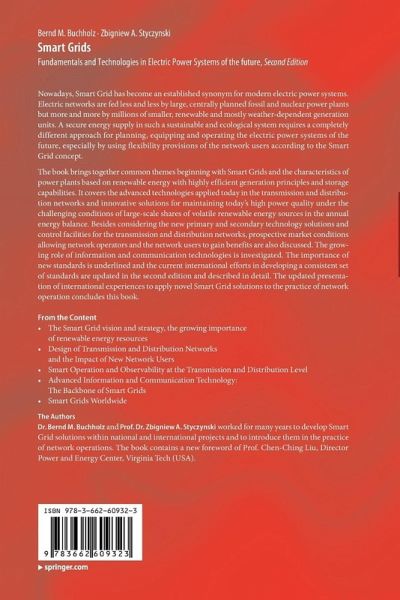 Nowadays, Smart Grid has become an established synonym for modern electric power systems. Electric networks are fed less and less by large, centrally planned fossil and nuclear power plants but more and more by millions of smaller, renewable and mostly weather-dependent generation units. A secure energy supply in such a sustainable and ecological system requires a completely different approach for planning, equipping and operating the electric power systems of the future, especially by using flexibility provisions of the network users according to the Smart Grid concept. The book brings together common themes beginning with Smart Grids and the characteristics of power plants based on renewable energy with highly efficient generation principles and storage capabilities. It covers the advanced technologies applied today in the transmission and distribution networks and innovative solutions for maintaining today's high power quality under the challenging conditions oflarge-scale shares of volatile renewable energy sources in the annual energy balance. Besides considering the new primary and secondary technology solutions and control facilities for the transmission and distribution networks, prospective market conditions allowing network operators and the network users to gain benefits are also discussed. The growing role of information and communication technologies is investigated. The importance of new standards is underlined and the current international efforts in developing a consistent set of standards are updated in the second edition and described in detail. The updated presentation of international experiences to apply novel Smart Grid solutions to the practice of network operation concludes this book.