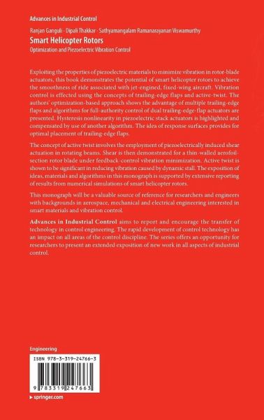 Exploiting the properties of piezoelectric materials to minimize vibration in rotor-blade actuators, this book demonstrates the potential of smart helicopter rotors to achieve the smoothness of ride associated with jet-engined, fixed-wing aircraft. Vibration control is effected using the concepts of trailing-edge flaps and active-twist. The authors' optimization-based approach shows the advantage of multiple trailing-edge flaps and algorithms for full-authority control of dual trailing-edge-flap actuators are presented. Hysteresis nonlinearity in piezoelectric stack actuators is highlighted and compensated by use of another algorithm. The idea of response surfaces provides for optimal placement of trailing-edge flaps.