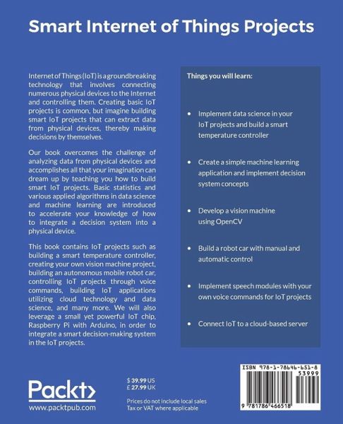 Discover how to build your own smart Internet of Things projects and bring a new degree of interconnectivity to your world Key Features: - Learn how to extract and analyse data from physical devices and build smart IoT projects - Master the skills of building enticing projects such as a neural network autonomous car, computer vision through a camera, and cloud-based IoT applications - This project-based guide leverages revolutionary computing chips such as Raspberry Pi, Arduino, and so on Book Description: Internet of Things (IoT) is a groundbreaking technology that involves connecting numerous physical devices to the Internet and controlling them. Creating basic IoT projects is common, but imagine building smart IoT projects that can extract data from physical devices, thereby making decisions by themselves. Our book overcomes the challenge of analyzing data from physical devices and accomplishes all that your imagination can dream up by teaching you how to build smart IoT projects. Basic statistics and various applied algorithms in data science and machine learning are introduced to accelerate your knowledge of how to integrate a decision system into a physical device. This book contains IoT projects such as building a smart temperature controller, creating your own vision machine project, building an autonomous mobile robot car, controlling IoT projects through voice commands, building IoT applications utilizing cloud technology and data science, and many more. We will also leverage a small yet powerful IoT chip, Raspberry Pi with Arduino, in order to integrate a smart decision-making system in the IoT projects. What You Will Learn: - Implement data science in your IoT projects and build a smart temperature controller - Create a simple machine learning application and implement decision system concepts - Develop a vision machine using OpenCV - Build a robot car with manual and automatic control - Implement speech modules with your own voice commands for IoT projects - Connect IoT to a cloud-based server Who this book is for: If you are hobbyist who is keen on making smart IoT projects, then this book is for you. You should have a basic knowledge of Python. Table of Contents - Make your IoT Projects Smart - Decision System for IoT Projects - Building your own Vision Machine - Make your own Autonomous Car Robot - Building Voice Technology on IoT Projects - Build Data Science-based Cloud for IoT Projects