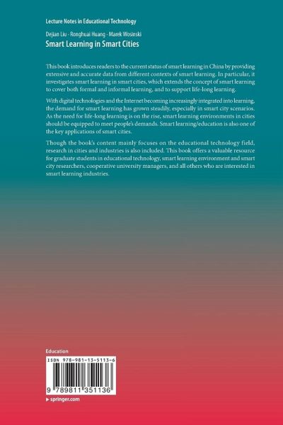 This book introduces readers to the current status of smart learning in China by providing extensive and accurate data from different contexts of smart learning. In particular, it investigates smart learning in smart cities, which extends the concept of smart learning to cover both formal and informal learning, and to support life-long learning.