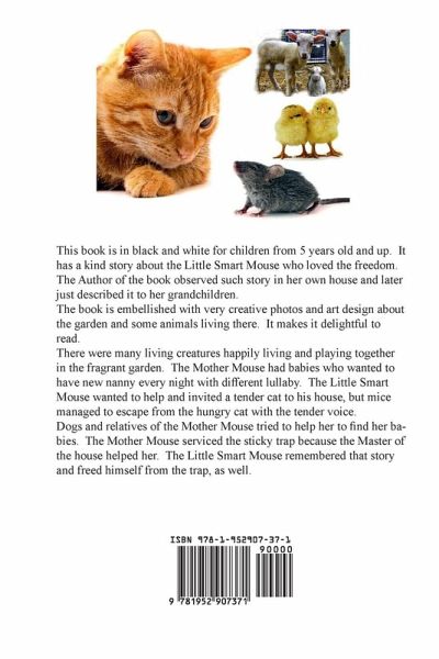 This book is for children from 5 years old and up. It has a kind story about Little Smart Mouse who loved freedom. The Author of the book observed such a story in her own house and later just described it to her grandchildren. The book is embellished with very creative photos of the garden and some animals living there. The art design makes it delightful to read. There were many living creatures happily living and playing together in the fragrant garden. The Mother Mouse had babies who wanted to have a new nanny every night with a different lullaby. The Little Smart Mouse wanted to help and invited a tender cat to his house, but mice managed to escape from the hungry cat with the tender voice. Dogs and relatives of the Mother Mouse tried to help her to find her babies. The Mother Mouse serviced the sticky trap because the Master of the house helped her. The Little Smart Mouse remembered that story and freed himself from the trap, as well.