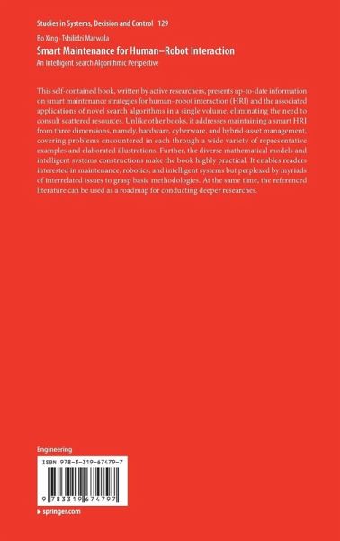 This self-contained book, written by active researchers, presents up-to-date information on smart maintenance strategies for human-robot interaction (HRI) and the associated applications of novel search algorithms in a single volume, eliminating the need to consult scattered resources. Unlike other books, it addresses maintaining a smart HRI from three dimensions, namely, hardware, cyberware, and hybrid-asset management, covering problems encountered in each through a wide variety of representative examples and elaborated illustrations. Further, the diverse mathematical models and intelligent systems constructions make the book highly practical. It enables readers interested in maintenance, robotics, and intelligent systems but perplexed by myriads of interrelated issues to grasp basic methodologies. At the same time, the referenced literature can be used as a roadmap for conducting deeper researches.
