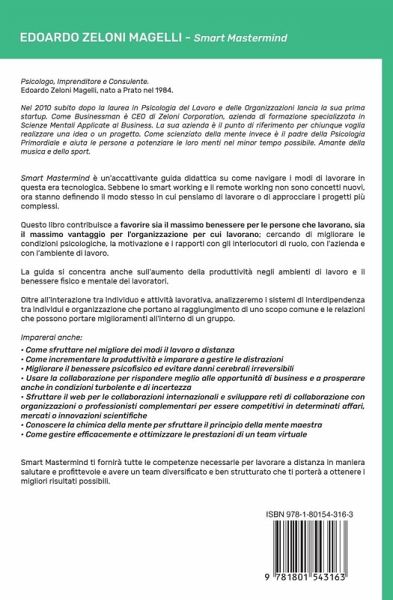 Smart Mastermind è un'accattivante guida didattica su come navigare i modi di lavorare in questa era tecnologica. Sebbene lo smart working e il remote working non sono concetti nuovi, ora stanno definendo il modo stesso in cui pensiamo di lavorare o di approcciare i progetti più complessi. Questo libro contribuisce a favorire sia il massimo benessere per le persone che lavorano, sia il massimo vantaggio per l'organizzazione per cui lavorano; cercando di migliorare le condizioni psicologiche, la motivazione e i rapporti con gli interlocutori di ruolo, con l'azienda e con l'ambiente di lavoro. La guida si concentra anche sull'aumento della produttività negli ambienti di lavoro e il benessere fisico e mentale dei lavoratori. Oltre all'interazione tra individuo e attività lavorativa, analizzeremo i sistemi di interdipendenza tra individui e organizzazione che portano al raggiungimento di uno scopo comune e le relazioni che possono portare miglioramenti all'interno di un gruppo. Imparerai anche: Come sfruttare nel migliore dei modi il lavoro a distanza Come incrementare la produttività e imparare a gestire le distrazioni Migliorare il benessere psicofisico ed evitare danni cerebrali irreversibili Usare la collaborazione per rispondere meglio alle opportunità di business e a prosperare anche in condizioni turbolente e di incertezza Sfruttare il web per le collaborazioni internazionali e sviluppare reti di collaborazione con organizzazioni o professionisti complementari per essere competitivi in determinati affari, mercati o innovazioni scientifiche Conoscere la chimica della mente per sfruttare il principio della mente maestra Come gestire efficacemente e ottimizzare le prestazioni di un team virtuale Smart Mastermind ti fornirà tutte le competenze necessarie per lavorare a distanza in maniera salutare e profittevole e avere un team diversificato e ben strutturato che ti porterà a ottenere i migliori risultati possibili.