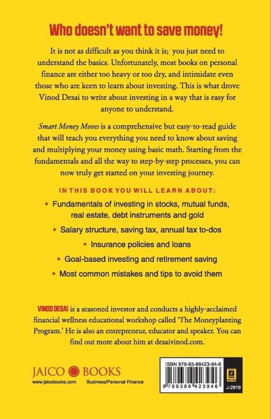 FOR GROWN UPS a.k.a. Kids with Money The most comprehensive, ruthlessly unbiased and easy-to-read guide on personal finance Who doesn't want to save money! It is not as difficult as you think it is; you just need to understand the basics. Unfortunately, most books on personal finance are either too heavy or too dry, and intimidate even those who are keen to learn about investing. This is what drove Vinod Desai to write about investing in a way that is easy for anyone to understand. Smart Money Moves is a comprehensive but easy-to-read guide that will teach you everything you need to know about saving and multiplying your money using basic math. Starting from the fundamentals and all the way to step-by-step processes, you can now truly get started on your investing journey. IN THIS BOOK YOU WILL LEARN ABOUT: ¿ Fundamentals of investing in stocks, mutual funds, real estate, debt instruments and gold ¿ Salary structure, saving tax, annual tax to-dos ¿ Insurance policies and loans ¿ Goal-based investing and retirement saving ¿ Most common mistakes and tips to avoid them VINOD DESAI is a seasoned investor and conducts a highly-acclaimed financial wellness educational workshop called 'The Moneyplanting Program.' He is also an entrepreneur, educator and speaker. You can find out more about him at desaivinod.com.