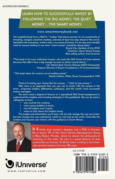 "An insightful book from a Wall St. " insider' that shows you how to win consistently at investing, navigate uncertain markets, and stay at least one step ahead of the crowd. Sprinkled with anecdotes, written with a wry sense of humor, it's an easy and valuable read for anyone looking to see what "smart money" should be doing today." Ernest Chu, Member of the NYSE Chairman, Green States Energy Best selling author, Soul Currency "This book is for every individual investor who feels like Wall Street left them behind because they didn't have a big enough account to attract sound advice." Col. Patrick Graf, Former Director NATO Partnership Program Director of Export Compliance L III Communications " This book takes the mystery out of making money" Daniel Lothian, White House Correspondent CNN Tired of investing your money like the masses....? Only to lose money..? Well, here is an approach that you can use to invest with the people in the know...corporate insiders, billionaires, politicians, and the world's most successful money managers. You don't need a degree in finance or a specialized Wall Street background to understand the insights and investing strategies in this guidebook. But you do need a willingness to learn ¿ who controls the markets; ¿ what causes bubbles to burst; ¿ why all insiders aren't equal; ¿ where to find where the insiders invest. The insight and information you'll learn will not only change the way you invest, but also change how you understand, relate to, and look at the world. Invest like the insiders and improve your returns with the guidance in Smart Money.