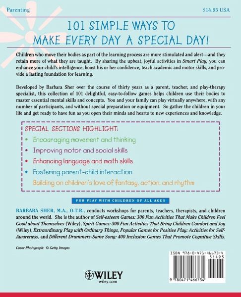 101 SIMPLE WAYS TO MAKE EVERY DAY A SPECIAL DAY! Children who move their bodies as part of the learning process are more stimulated and alert-and they retain more of what they are taught. By sharing the upbeat, joyful activities in Smart Play, you can enhance your child's intelligence, boost his or her confidence, teach academic and motor skills, and provide a lasting foundation for learning. Developed by Barbara Sher over the course of thirty years as a parent, teacher, and play-therapy specialist, this collection of 101 delightful, easy-to-follow games helps children use their bodies to master essential mental skills and concepts. You and your family can play virtually anywhere, with any number of participants, and without special preparation or equipment. So gather the children in your life and get ready to have fun as you open their minds and hearts to new experiences and knowledge. SPECIAL SECTIONS HIGHLIGHT: * Encouraging movement and thinking * Improving motor and social skills * Enhancing language and math skills * Fostering parent-child interaction * Building on children's love of fantasy, action, and rhythm